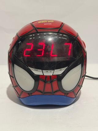 Sveglia originale Spider-Man Marvel a forma di testa dell’Uomo Ragno, modello con display digitale rosso, radio FM/AM e funzione proiezione dell’orario con simbolo Spider-Man su parete o soffitto. Dalle foto può sembrare che il display non si legga bene a causa della luce e dei riflessi, ma l’orario si vede perfettamente dal vivo. Il display è nitido e ben visibile. Radio funzionante. Proiezione attiva e funzionante come da immagine. Funzioni snooze, sleep e impostazione sveglia presenti. Modello ufficiale Marvel 2010, ideale per cameretta, collezionisti Spider-Man o amanti gadget anni 2000/2010. Condizioni buone generali
