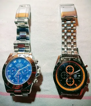 Lotto composto da due orologi automatici. Perfettamente funzionanti e in ottimo stato.Ambedue con bracciali in acciaio e fondelli a ghiera.Sono ottime Riproduzioni ma con meccanismi affidabili e precisi.Non sono presenti le scatole originali ma la Spedizione sarà veloce e con ottimo imballo.