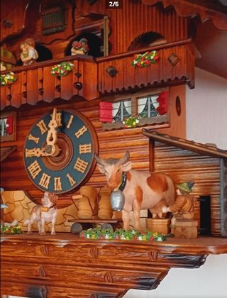 Bellissimo orologio a cucù in legno, un pezzo unico per la tua casa. - Design tradizionale con dettagli intagliati. - Figure animate che arricchiscono la scena. - Pendoli e contrappesi inclusi.