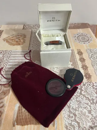 Set Zenith composto apricasse zenith con scatola originale, una pochette porta orologio in velluto e una lente d'ingrandimento. Prezzo totale
