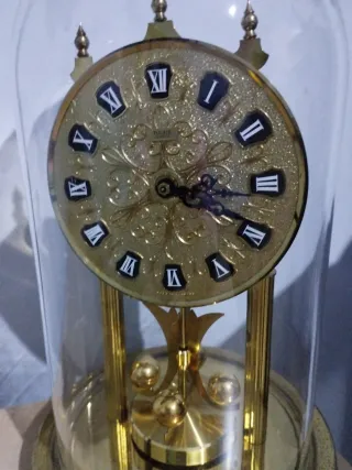 Elegante orologio da tavolo vintage con campana in vetro. - Base e struttura in ottone lucido. - Quadrante con numeri romani. - Pendolo con sfere. - Design classico e raffinato.
