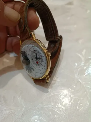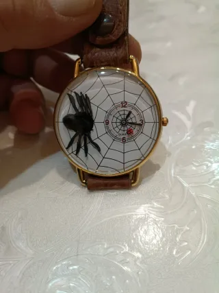 Orologio da polso con quadrante a tema ragnatela e ragno. - Movimento al quarzo. - Cinturino in pelle marrone. - Cassa dorata. Diametro cassa 45 escluso corona