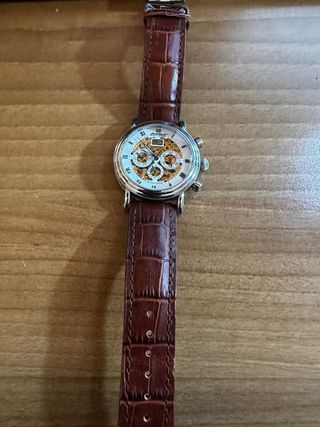 Orologio Breil da uomo con movimento al quarzo e funzione cronografo. La cassa è in metallo dorato con una ghiera in legno scuro, mentre il cinturino è in pelle marrone effetto coccodrillo. - Quadrante blu. - Vetro minerale. - Resistente all'acqua (specificare la profondità se nota). - Chiusura con fibbia. Come nuovo perfettamente funzionante ghiera in legno diametro cassa 40 escluso corona