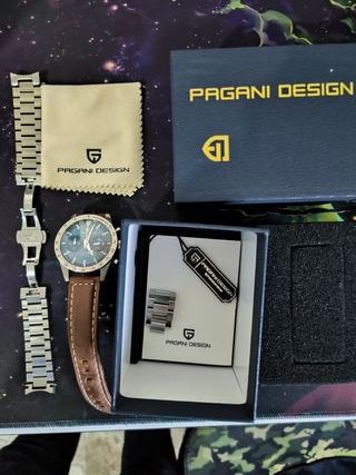 Orologio cronografo Pagani Design azzurro originale in scatola originale. Compreso di strap a maglia originale con apertura a farfalla e strap in pelle marrone a rilascio rapido. Vetro in zaffiro parzialmente riflettente, effetto ottico che si fa notare. Cassa da 42mm, strap da 20mm