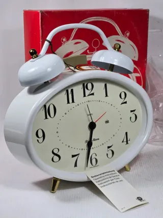 Grande orologio sveglia vintage con doppia campana e movimento elettrico risalente agli anni '80, di colore bianco. L'oggetto è nuovo e funzionante viene fornito con la sua scatola originale. - Design classico con campane. - Movimento al quarzo. - Piedini dorati. - Scatola originale inclusa.