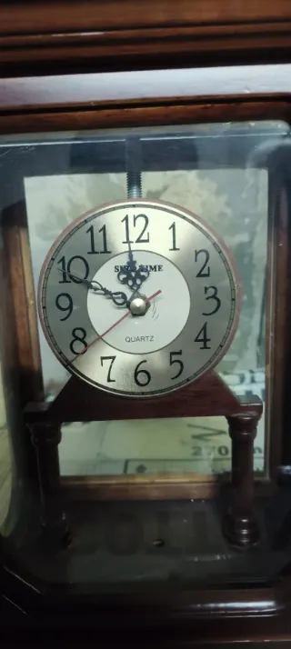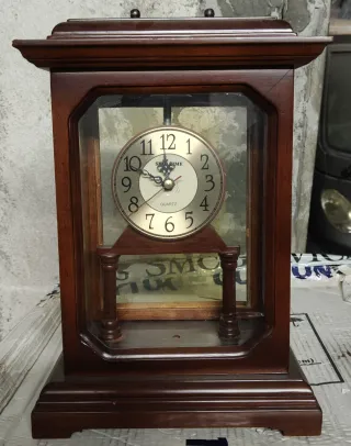 Elegante orologio in legno scuro, con cassa trasparente che permette di ammirare il meccanismo. - Cassa in legno di colore marrone scuro. - Quadrante rotondo con numeri arabi. - Movimento al quarzo. Solo un vetro laterale si è rotto purtroppo.