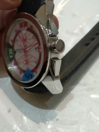 Orologio Locman modello Cavallo Pazzo con movimento al quarzo e funzione cronografo. - Cassa in acciaio. - Cinturino in gomma nero. - Quadrante bianco con dettagli rossi e blu. - Indici e lancette a contrasto. Come nuovo diametro cassa 47 escluso corona e tasti