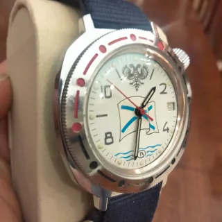 Orologio Vostok Komandirskie Armata Russa di Mare vintage. Un pezzo da collezione con un design distintivo. - Quadrante bianco con aquila bicipite e bandiera. - Movimento 2414 A meccanico a 17 rubini PERFETTAMENTE funzionante. - Cinturino in tessuto blu nuovo Lievissimi segni di usura come da foto.