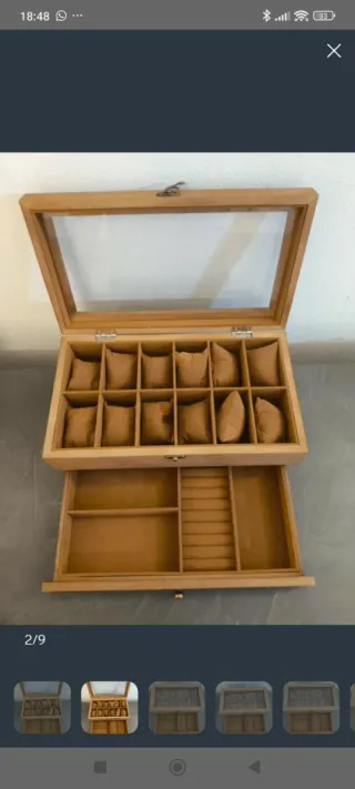 Elegante scatola in legno per conservare i tuoi orologi. - Finitura in legno naturale. - Coperchio trasparente per visualizzare gli orologi. - Divisa in scomparti per una migliore organizzazione. - Cassetto estraibile per ulteriore spazio.