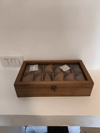 Elegante scatola in legno per riporre i tuoi orologi. Presenta un coperchio trasparente per una facile visualizzazione e un cassetto estraibile per ulteriore spazio. - Finitura in legno naturale. - Vano superiore con 12 scomparti. - Cassetto con divisori per gioielli o accessori.