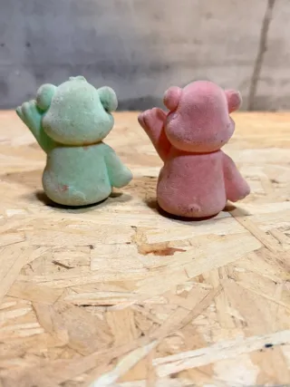 Due orsetti da collezione in plastica, tipici degli anni '80 e '90. - Orsetto viola con fiore sul pancino. - Orsetto rosa con arcobaleno e stella sul pancino, tiene un pulcino giallo in mano.