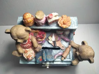 Scatola decorativa con design di orsetti in una cucina. Dettaglio di figure di orsetti. Motivi di cucina con alimenti e utensili. Design colorato e divertente.
