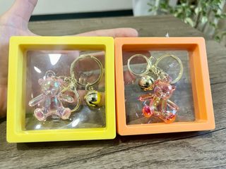 Set di due portachiavi con simpatici orsetti teddy. Ogni orsetto ha una finitura perlescente che riflette la luce. - Design a forma di orsetto. - Finitura perlescente iridescente. - Campanellino dorato incluso.