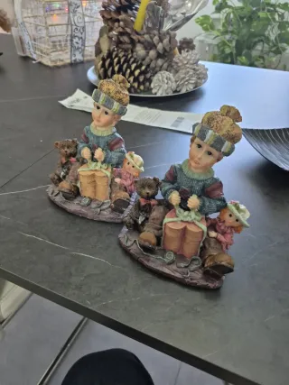 Set di due figure decorative natalizie. - Figure di bambini con cappelli e sciarpe. - Ogni figura include diversi orsetti di peluche. - Base decorativa con dettagli. - Ideale per l'ambientazione festiva. Misure 17x12, coppia di figure di Natale con orso e bambola. 12 euro la coppia
