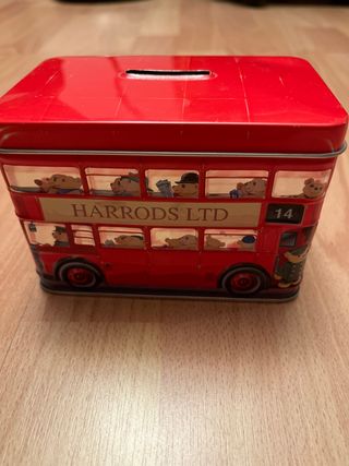 Lata originale Harrods LTD con design di autobus inglese a due piani. Decorata con simpatici orsetti. Coperchio rosso con fessura per monete.