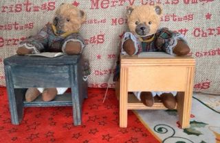 Set di due adorabili orsetti di peluche e ceramica antichi, ciascuno seduto sul proprio banco. Orsetti di peluche con abiti a quadri. Banchi in miniatura in legno. Ogni orsetto ha un pezzo di carta con scrittura.