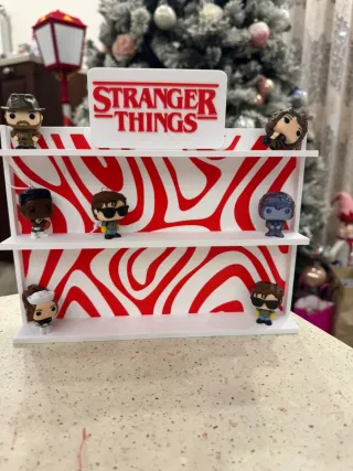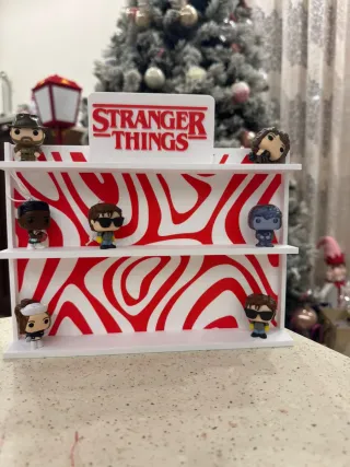 Espositore a tema Stranger Things, perfetto per collezionisti. - Design con logo Stranger Things. - Struttura bianca con decorazioni rosse. - Ideale per esporre Funko Pop o altri oggetti da collezione.