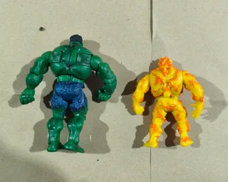Set di due action figure vintage dei personaggi Marvel. - Action figure di Hulk in verde con pantaloncini blu 15 cm totalmente snodabile 2003. - Action figure di Zzzax con dettagli fiammeggianti gialli e arancioni. Aveva un meccanismo che lo faceva tremare non più funzionarte, molla allentata.