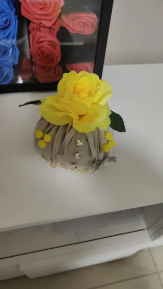 Deliziosa decorazione a forma di sacchetto con fiori gialli e dettagli scintillanti. Perfetta per un regalo o un tocco di allegria. - Fiori artificiali gialli. - Dettagli con strass e perle. - Scritta Auguri decorata con perline gialle.
