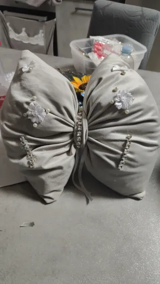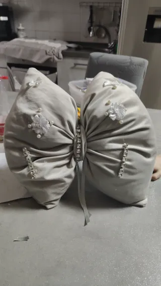 Fiocco decorativo in tessuto grigio, impreziosito da perle e strass. - Dettagli floreali bianchi. - Elegante fascia centrale con strass. - Nastrini pendenti in raso.
