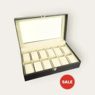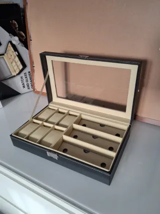Elegante scatola per riporre fino a 12 orologi. - Rivestimento esterno in similpelle nera. - Interno foderato in tessuto color crema. - Coperchio trasparente con chiusura a scatto.