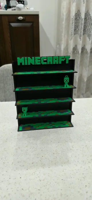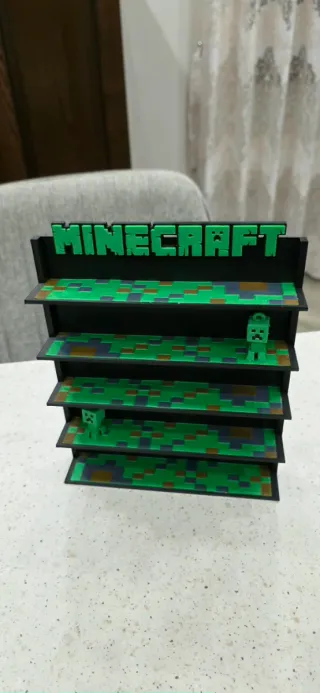 Espositore a tema Minecraft, ideale per collezionisti o appassionati del gioco. - Design ispirato a Minecraft. - Struttura a più livelli per esporre personaggi e oggetti. - Include elementi decorativi come il logo Minecraft