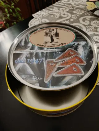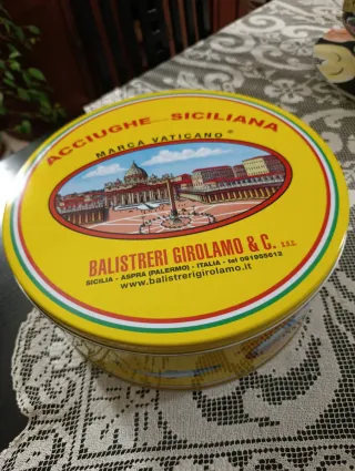 Scatola di latta rotonda con decorazione Acciughe Siciliana Marca Vaticano. - Immagine di Piazza San Pietro a Roma. - Dettagli del produttore: Balistreri Girolamo & C. S.A.C. - Indirizzo: Sicilia - Aspra (Palermo) - Italia. - Contatti telefonici e sito web del produttore.