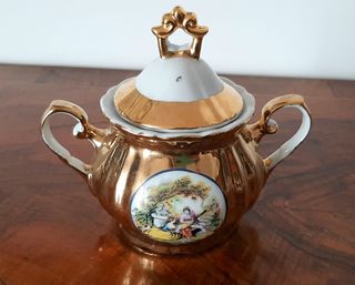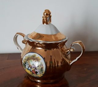 Zuccheriera in porcellana lustro oro 24k - Scena galante stile Fragonard - Anni '50/'60. Soggetto: Scena galante ("Courting Couple") ispirata alle opere del pittore rococò francese Jean-Honoré Fragonard. Rappresenta una coppia in abiti settecenteschi in un giardino. Finitura: La superficie esterna è completamente dorata con un effetto specchiato (lusterware), mentre l'interno è in porcellana bianca smaltata. il marchio è ben leggibile e la doratura è integra