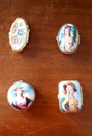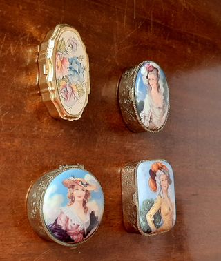 Lotto composto da quattro portapillole vintage risalenti alla seconda metà del XX secolo, realizzati in metallo dorato e argentato con interni in plastica. I coperchi sono finemente decorati con miniature in stile settecentesco/rococò raffiguranti dame eleganti, motivi floreali policromi e raffinate incisioni ornamentali interne con lettera decorativa. Ogni portapillole è dotato di chiusura a scatto e cerniera perfettamente funzionanti. Le forme, diverse tra loro (ovali, rettangolari e sagomate), rendono il lotto particolarmente armonioso e gradevole dal punto di vista collezionistico e decorativo.