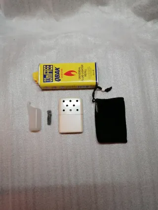 Scaldamani Zippo di colore bianco, completo di accessori. - Scaldamani Zippo bianco - carburante di ricarica - Custodia in tessuto nero - mini tanica per dosare - stoppino di ricambio