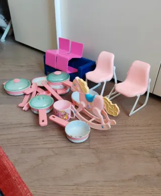 Lotto di accessori per la casa delle bambole, originali Barbie Mattel. - Include mobili come divanetto e sedie. - Presenti accessori per la cucina come pentole, piatti e posate. - Include cavalluccio a dondolo e altri piccoli accessori.