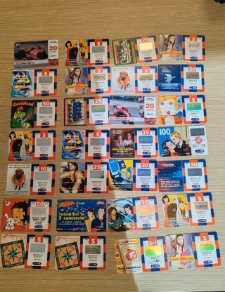 Lotto di 14 schede ricarica telefoniche vintage. - Schede Omnitel e Vodafone. - Valori da 10€ e 50€. - Alcune con immagini Summer Card e Carica. - Ideali per collezionisti.