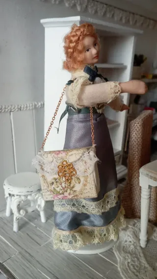 Añade un toque de distinción a tu casa de muñecas con este precioso bolsito artesanal (escala 1:12). Confeccionado en tela con motivo floral romántico, detalles de encaje blanco y una elegante cadena dorada. Estado impecable, como nuevo. Una pieza de coleccionista que evoca la elegancia del siglo XIX. ✨ Splendida borsetta in miniatura scala 1:12. Realizzata in tessuto damascato a fiori con raffinati dettagli in pizzo e catenella dorata. Condizioni pari al nuovo, perfetta per arricchire una scena vittoriana o una camera da letto d'epoca. Un piccolo tesoro di alta precisione. 🌹