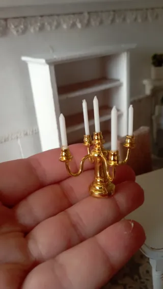 Ilumina tu casa de muñecas con este majestuoso candelabro de 5 brazos (escala 1:12). Con un acabado dorado brillante y velas blancas detalladas, es la pieza central ideal para un comedor aristocrático o un salón de baile victoriano. Estado impecable, como nuevo. Fabricado con gran detalle para aportar un toque de lujo y realismo a tus escenas clásicas. Una joya para coleccionistas que cuidan cada pequeño detalle decorativo. ✨🕯️ Elegante candelabro dorato a 5 bracci in miniatura scala 1:12. Finitura lucida e candele bianche, perfetto per ambienti nobiliari o cene romantiche d'epoca. Condizioni pari al nuovo. 🏛️
