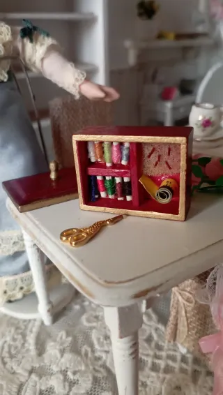 Completa tu casa de muñecas con este encantador costurero artesanal (escala 1:12). Forrado en tela romántica con motivo de rosas y detalles de encaje, incluye en su interior miniaturas de hilos, tijeras y accesorios de costura. Estado impecable, como nuevo. Una pieza llena de realismo y nostalgia, ideal para crear una escena de labores en un salón o dormitorio victoriano. Un detalle exquisito que enamorará a cualquier coleccionista de miniaturas. ✨🧵 Splendido cestino da cucito in miniatura scala 1:12. Rivestito in tessuto floreale e pizzo, completo di accessori interni. Condizioni pari al nuovo, perfetto per un diorama romantico. ?