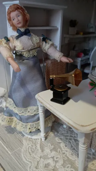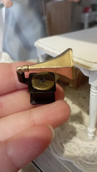 Viaja al pasado con este espectacular gramófono en miniatura (escala 1:12). Con su gran trompeta dorada y base de madera detallada, es la pieza perfecta para dar vida al salón de tu casa de muñecas. Estado impecable, como nuevo. Un objeto que evoca las melodías de principios del siglo XX y aporta un aire aristocrático y refinado a cualquier escena victoriana. Ideal para coleccionistas que buscan autenticidad y elegancia en cada pequeño detalle. ✨🎶 Splendido grammofono in miniatura scala 1:12. Base rifinita e tromba dorata, condizioni pari al nuovo. Un pezzo iconico per un salotto d'altri tempi. 🎺