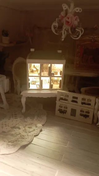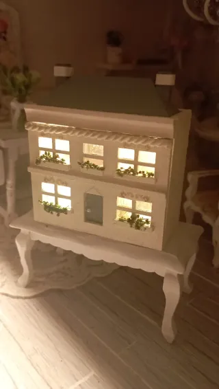 Esclusiva miniatura 1:12 trasformata a mano. Stile vittoriano con dettagli unici: finestre in plexiglass, fioriere e interni arredati (letto, camino, stufa). Progetto grafico originale per tappezzerie e pavimenti. Ogni stanza è illuminata da LED con fili a scomparsa e interruttore sul retro. Pile incluse! Pezzo unico da collezione, perfetto per dollhouse o esposizione. Misure: 6,3 x 6,7 x 3,3 cm. Materiali: Legno, metallo, carta, plexiglass. Spedizione curata e sicura.
