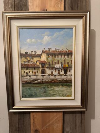 Dipinto ad olio su tela raffigurante vecchie case sul naviglio grande del 1992 - Opera firmata dall'artista Claudio di Costanzo. - Cornice dorata inclusa Accetto offerte