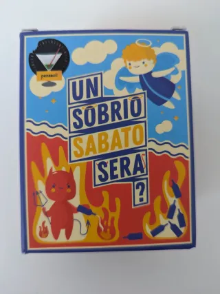 Carte da gioco a tema Un Sobrio Sabato. - Illustrazioni colorate con angelo e diavoletto. - Scritta Un Sobrio Sabato Sera? al centro. - Design vivace e originale.