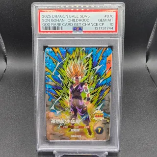 Carta Son Gohan: Childhood della serie Dragon Ball SDV5, numero 076. La carta è stata valutata PSA 10. - Serie: Dragon Ball SDV5 - Personaggio: Son Gohan (Childhood) - Numero carta: 076 - Valutazione: PSA 10 GEM MT