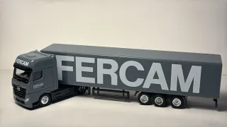 Modellino di un camion Mercedes con rimorchio Fercam. - Colore grigio. - Dettagli del marchio Fercam sul rimorchio e sulla cabina.