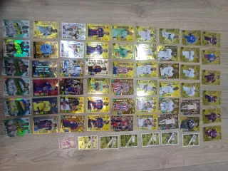 Collezione di carte da calcio, alcune con dettagli dorati. Ideali per collezionisti. - Più di 100 carte in totale. - Varietà di giocatori e squadre. - Alcune carte presentano segni di utilizzo.