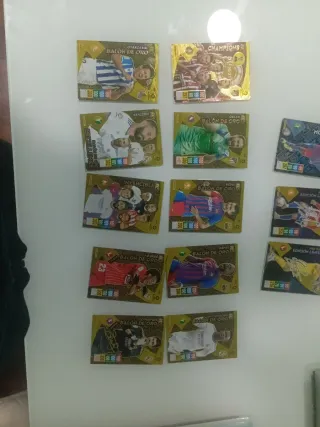 Conjunto vario di figurine di calcio Adrenalyn, incluse edizioni limitate e carte Pallone d'Oro. Contiene figurine di giocatori come Odegaard, Parejo, Ter Stegen, Griezmann, Guedes, Yeremy P., Unai Simón, Julian, Vinicius, Isco-Lo Celso, Dani e Oblak. Include carte di edizione limitata e Pallone d'Oro. Diverse statistiche e punteggi visibili sulle carte.