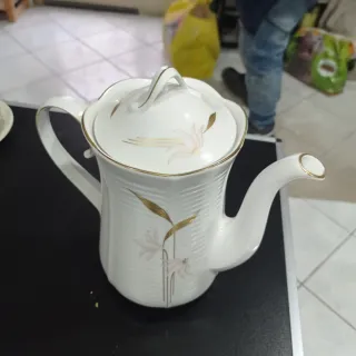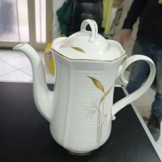 Elegante teiera vintage in porcellana bianca, decorata con delicati fiori e foglie dorate. Perfetta per servire tè o caffè.con bordo in oro zecchino - Design raffinato con finiture dorate. - Motivo floreale stilizzato. - Manico e coperchio coordinati.