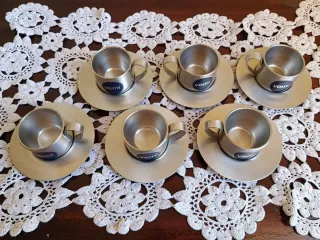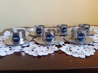 Servizio da caffe VEMI tazzine caffè con piattino per 6 persone in acciaio inossidabile 18/10, prodotte in Italia negli anni '80. Sono realizzate in acciaio inossidabile. Il set include tazze e piattini. Le tazze sono termiche. Hanno una capacità di circa 90ml.