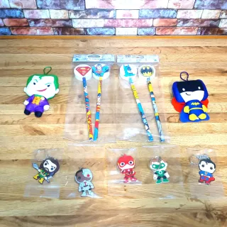 Lotto di 11 gadget originali DC Comics, nuovi e perfetti come idea regalo o collezione. Il set include: 5 Portachiavi Justice League (Superman, Flash, Aquaman, Lanterna Verde, Cyborg) ancora in bustina. 4 Matite con maxi-gomma (2 set sigillati di Batman e Superman). 2 Mini peluche/charm di Batman e Joker con asola per zaino. Tutto in condizioni eccellenti, mai usato. Ottimo per pensierini o amanti dei supereroi. Consegna a mano o spedizione rapida e sicura. #dc #justiceleague #batman #superman #joker #supereroi #gadget #scuola #regalo #collezionismo #keychain #comics