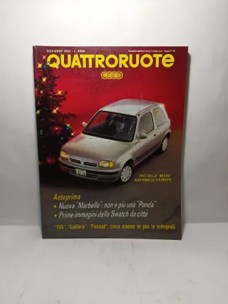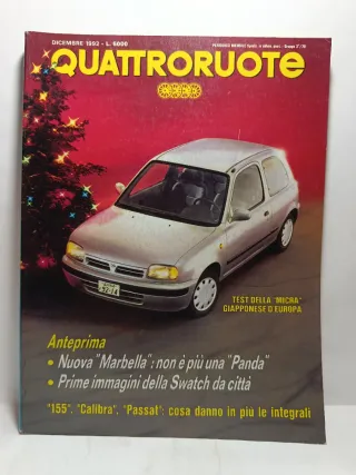 Rivista automobilistica Quattroruote, numero 446, datata Dicembre 1992. - Test della Nissan Micra. - Anteprima: Nuova Marbella, Swatch da città. - Approfondimenti su 155, Calibra, Passat. 🛍️ Acquisti multipli? Risparmia subito! Se sei interessato a più articoli della mia bacheca, contattami prima dell'acquisto! Creerò per te un set personalizzato con: 📦 Unica spedizione (risparmi sui costi di invio). 🏷️ Sconto immediato del 10% sul totale del tuo ordine. 🚫 Non accetto offerte per importi così piccoli.