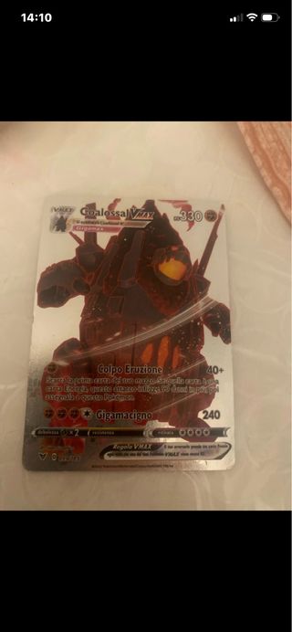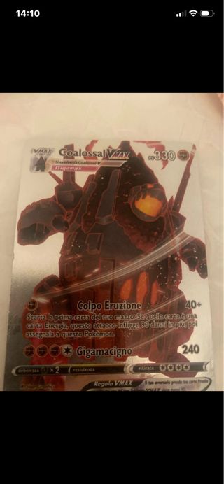 Carta Pokemon Coalossal VMAX in ottime condizioni. - Carta Colpo Eruzione. - Gigamacigno. - HP 330. - Debolezza x2. - Resistenza. - Costo di ritirata 0000. - Regole VMAX.