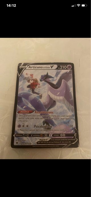 Carta Pokémon Articuno di Galar V in ottime condizioni. - Articuno di Galar V - HP 210 - Abilità: Ricostituzione - Attacco: Psicobagliore (110 danni) - Debolezza x2 - Resistenza -30 - Costo di ritirata 00