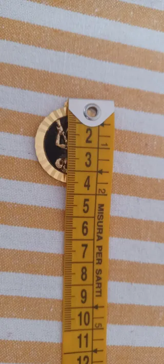 Vintage, souvenir francese. Ciondolo religioso, cattolico, con immagine San Cristoforo. Lievi segni di ossidazione e del tempo. Misure e dettagli in foto. Guardarle tutte. Il design circolare presenta una figura centrale su sfondo scuro, circondata da raggi. - Ciondolo in metallo dorato. - Raffigurazione di San Cristoforo. - Dettagli a raggiera sul bordo.